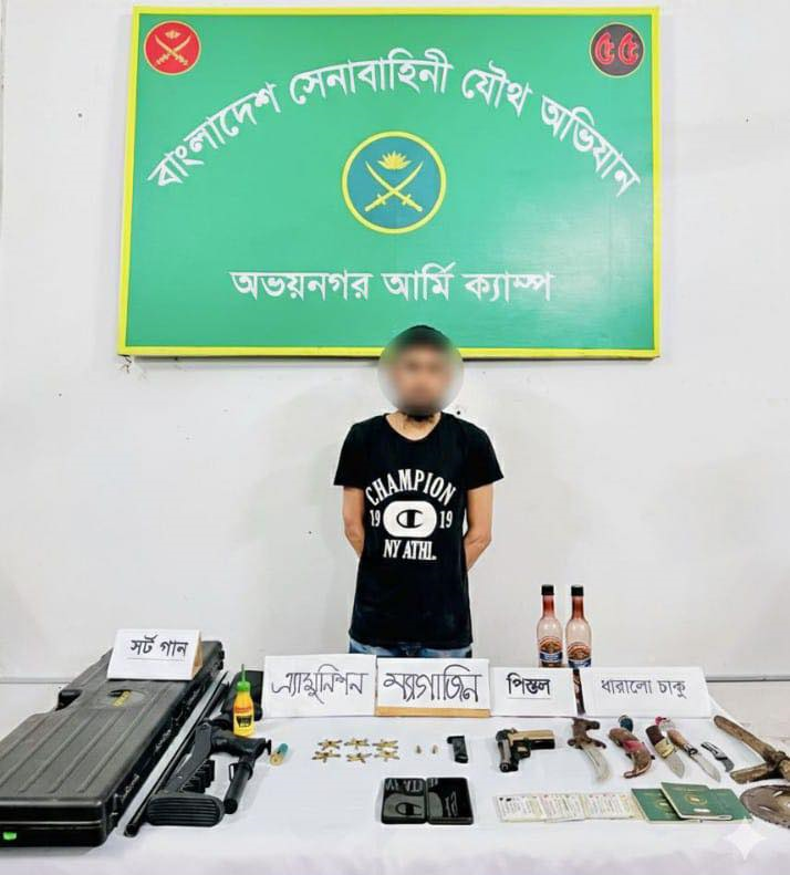 যশোর ও ঝিনাইদহ জেলায় সেনাবাহিনীর নেতৃত্বে পরিচালিত পৃথক যৌথ অভিযানে একটি পিস্তল, বিপুল পরিমাণ গোলাবারুদ, দেশীয় অস্ত্র এবং ১২টি ককটেল বোমা উদ্ধার করা হয়েছে। এ ঘটনায় একজনকে গ্রেপ্তার করা হয়েছে।