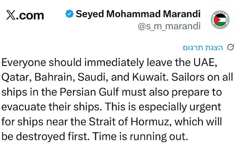 মোহাম্মদ মারান্দি তার এক টুইট বার্তায় বলেছেন, “সবাইকে অবিলম্বে সংযুক্ত আরব আমিরাত, কাতার, বাহরাইন, সৌদি আরব এবং কুয়েত ত্যাগ করতে হবে।পারস্য উপসাগরের সমস্ত জাহাজের নাবিকদেরও তাদের জাহাজ খালি করার জন্য প্রস্তুত হতে হবে।
