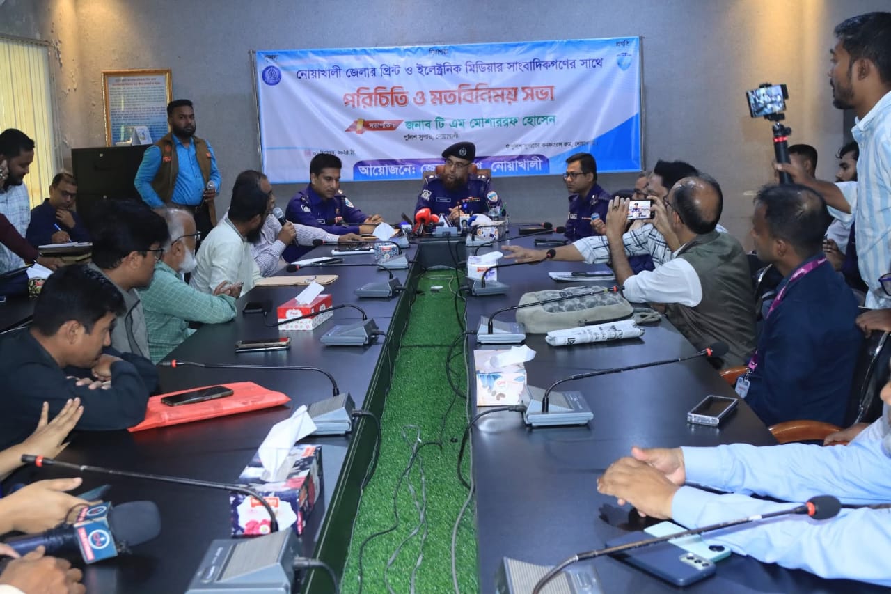 আজ ০১লা ডিসেম্বর ২০২৫ খ্রি. নোয়াখালী পুলিশ সুপারের কার্যালয়ের সম্মেলন কক্ষে নবাগত পুলিশ সুপার জনাব টি. এম. মোশাররফ হোসেন মহোদয়ের সভাপতিত্বে নোয়াখালী জেলার ইলেকট্রনিক ও প্রিন্ট মিডিয়ার গণমাধ্যমকর্মী এবং সাংবাদিকবৃন্দের সাথে পরিচিতি ও সৌহার্দ্যপূর্ণ মতবিনিময় সভা অনুষ্ঠিত হয়।